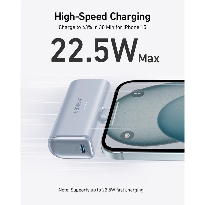 Two-Port High-Speed Charging: Experience high-speed charging with dual USB-C ports and advanced PowerIQ 3.0 technology, delivering an impressive 22.5W output. Foldable USB-C Connector: Say goodbye to cable tangles and protect your USB-C connector with a convenient foldable design for hassle-free charging. The Perfect Size: Enjoy the perfect blend of style and functionality, meticulously crafted to effortlessly fit into your pocket or purse. All-Day Power: Get uninterrupted charging during your travels with the reliable 5,000mAh capacity, keeping your devices powered up wherever you go. What You Get: Anker Nano Power Bank (22.5W, Built-In USB-C Connector), 2 ft / 0.6 m USB-C to USB-C cable, welcome guide, user manual, 24-month worry-free warranty, and our friendly customer service. Fast. Portable. Foldable. With dual USB-C ports and a foldable connector, the power bank provides an efficient and compact solution for your charging needs. Reduce. Reuse. Recharge. The eco-friendly design features an exterior made from 75% post-consumer recycled (PCR) materials, so you can charge your devices responsibly. Safe Bi-Directional Charging: With the two-way charging feature, charge and recharge your devices using the built-in USB-C port or an additional USB-C cable, and stay protected with ActiveShield™ 2.0's enhanced safety system and the dynamic temperature sensor. Seamless Compatibility with Your Case: Charge your device without hassle as the connector is designed to fit snugly with phone cases up to 4.9 mm thick. With the Built-In USB-C Connector/ USB-C to USB-C Cable Samsung S22 and S23 Series Samsung Note20 / Note20 Ultra Huawei Mate / P Series iPad Pro / Air Series And More With a USB-C to Lightning Cable (Sold Separately) iPhone 12 / 13 / 14 Series iPad 9th Generation AirPods Series And More With the Built-In USB-C Connector / USB-C to USB-C Cable With a USB-C to Lightning Cable (Sold Separately) Fast. Portable. Foldable. With dual USB-C ports and a foldable connector, the power bank provides an efficient and compact solution for your charging needs. Reduce. Reuse. Recharge. The eco-friendly design features an exterior made from 75% post-consumer recycled (PCR) materials, so you can charge your devices responsibly. Safe Bi-Directional Charging With the two-way charging feature, charge and recharge your devices using the built-in USB-C port or an additional USB-C cable, and stay protected with ActiveShield™ 2.0's enhanced safety system and the dynamic temperature sensor. Seamless Compatibility with Your Case Charge your device without hassle as the connector is designed to fit snugly with phone cases up to 4.9 mm thick. With the Built-In USB-C Connector / USB-C to USB-C Cable Samsung S22 and S23 Series Samsung Note20 / Note20 Ultra Huawei Mate / P Series iPad Pro / Air Series And More With a USB-C to Lightning Cable (Sold Separately) iPhone 12 / 13 / 14 Series iPad 9th Generation AirPods Series