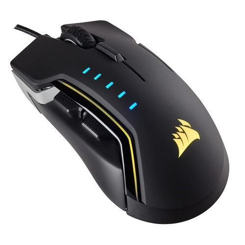 The Corsair GLAIVE RGB Optical Gaming Mouse features an optical PMW3367 sensor with selectable report rates of 1000Hz, 500Hz, 250Hz, or 125Hz, optimized for FPS gaming. Designed for a palm grip, it includes 6 programmable buttons with Omron switches rated for 50 million clicks and on-board memory supporting 1 profile. The mouse offers 3-zone RGB backlighting and connects via a 1.8m braided fiber cable. The package includes the GLAIVE RGB Optical mouse, an accessory bag, two additional thumb grips, a quick start guide, and a warranty card. It supports CUE 2.0 software, comes with a 2-year warranty, and weighs 181 grams.
