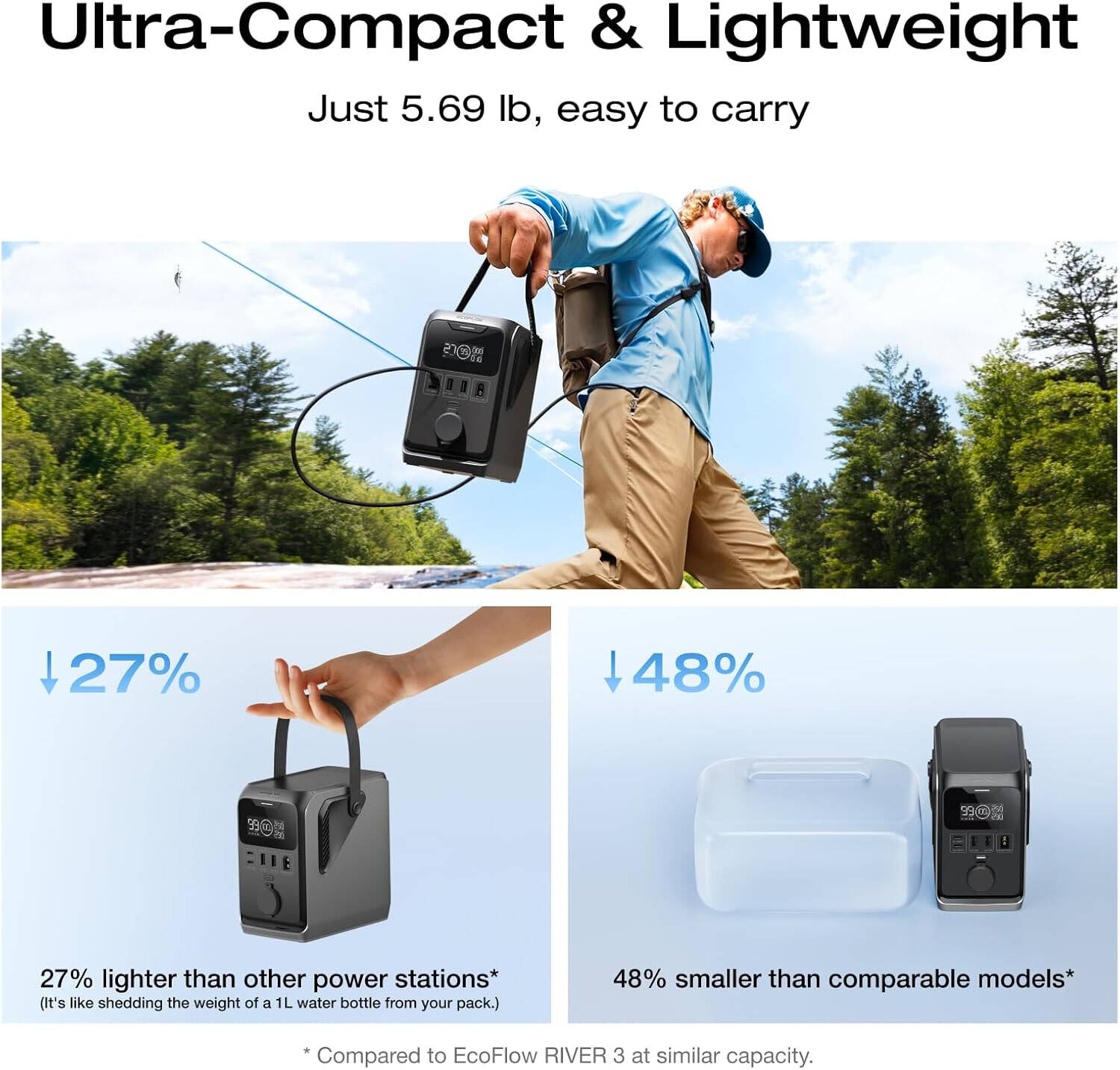 Small Size, Big Power Ultra-compact portable power station with 288Wh capacity (equal to 9 standard power banks). Delivers 300W pure DC output (up to 140W per port). Perfect for camping, travel, hiking, and emergency backup. More Ports, More Sharing Charge up to 5 devices simultaneously with multiple DC outputs: 2 × USB-A (12W) 2 × USB-C PD3.1 (140W in/out) 1 × 12V car port (10A) Ideal for families, groups, and multi-device setups. Ultra-Compact & Lightweight 48% smaller and 27% lighter than comparable portable power stations.* Easily fits in backpacks; reduces your carry load by the weight of 1 liter of water. Designed for maximum portability during hiking, road trips, and camping. *Compared to EcoFlow RIVER 3 in the same capacity class. 90% Gear Compatibility Pure DC output powers 90% of essential outdoor equipment. Can run high-demand devices such as 12V electric coolers. Ideal for outdoor adventures and works great as a solar generator (solar panels sold separately). Built Tough & Reliable Includes five layers of protection for safety and durability. Premium LiFePO4 battery ensures long life and stable performance. Engineered to withstand drops, bumps, and rugged travel. Rapid, Flexible Recharging Multiple fast-charging options: Car charging: 110W max Solar charging: 110W max Dual USB-C fast charging: 2 × 140W, reaching 0–80% in ~85 minutes Reliable power anywhere—no more battery anxiety.