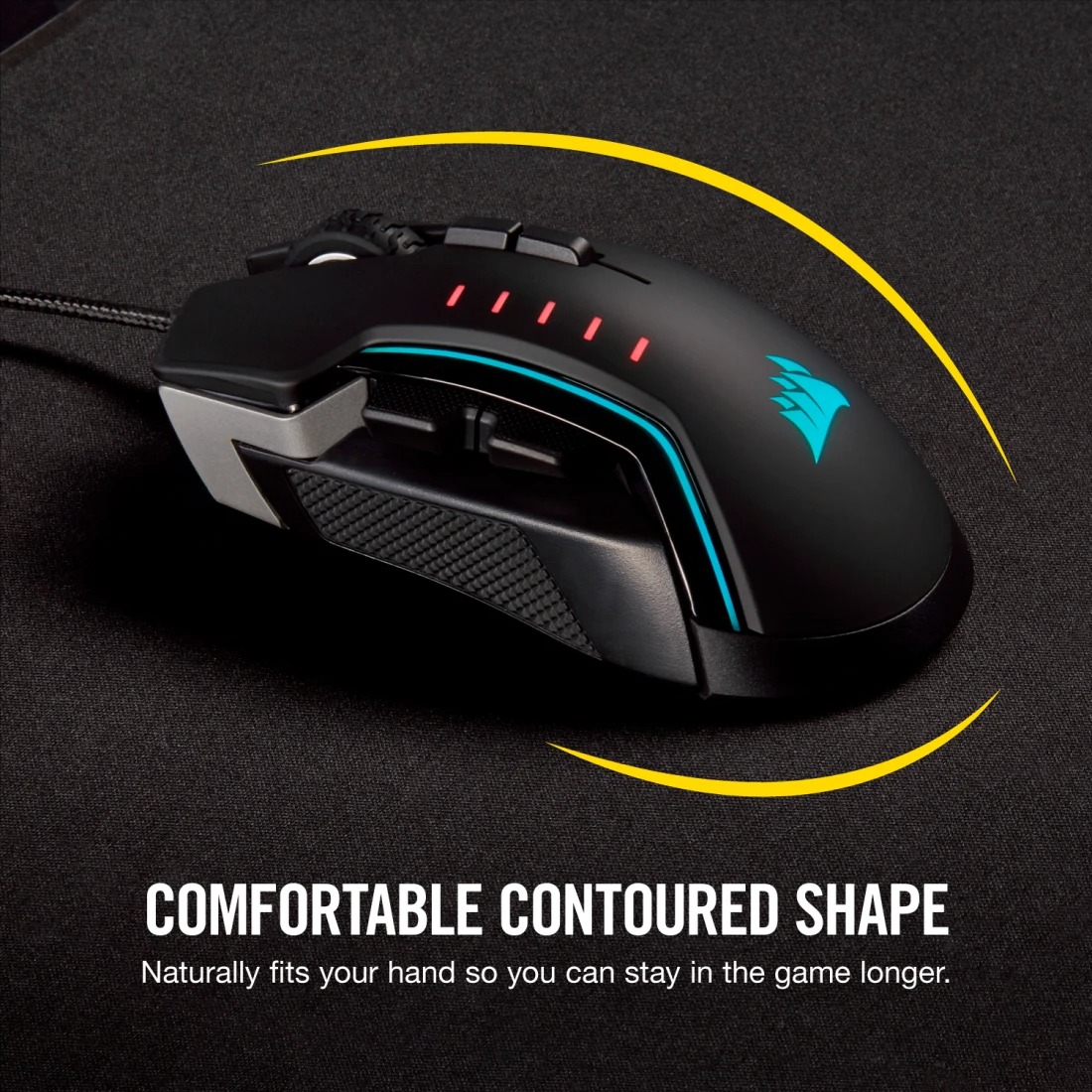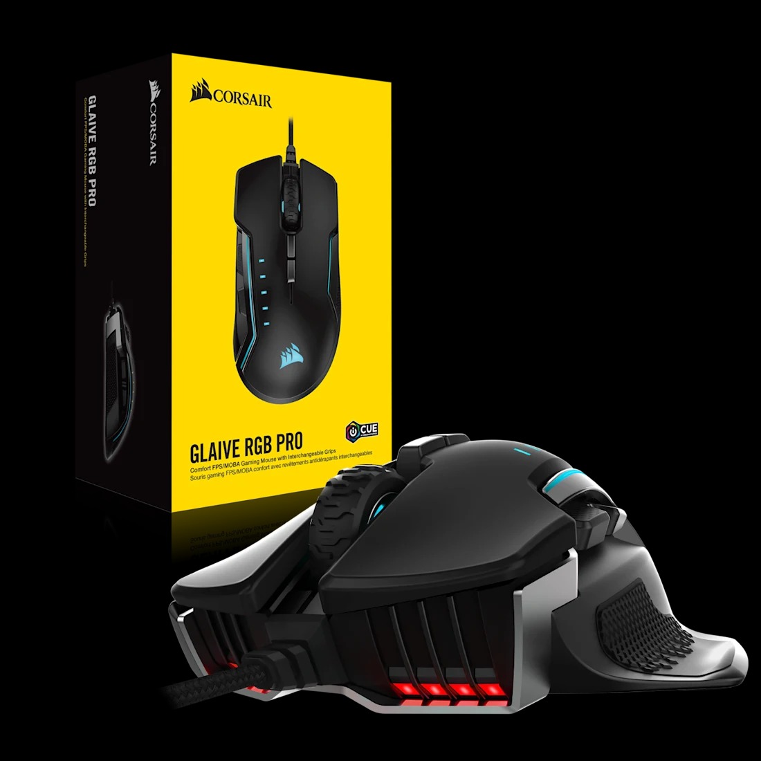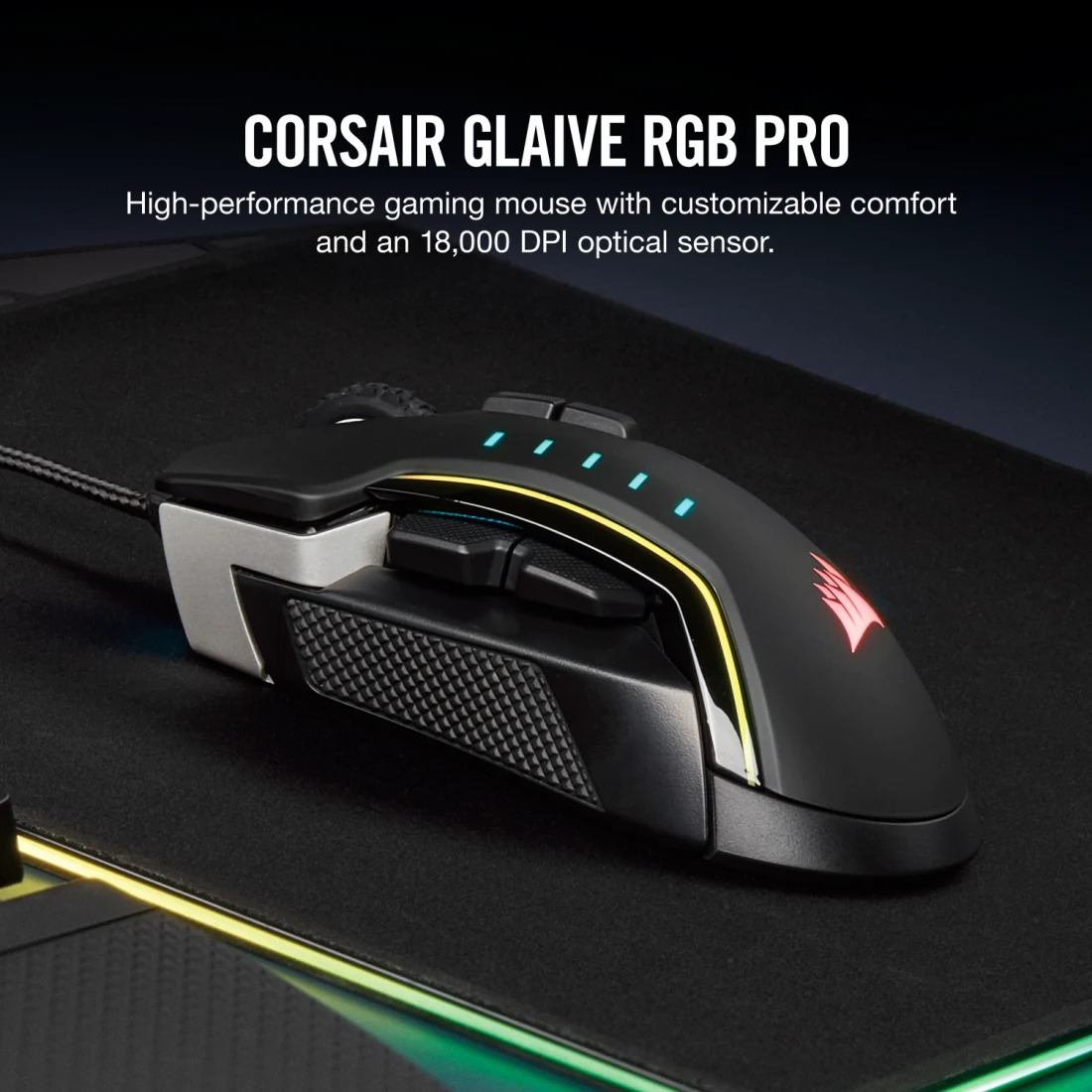 The CORSAIR GLAIVE RGB PRO gaming mouse merges high performance with high comfort, developed with a contoured shape designed for extended gaming sessions and an ultra-accurate, gaming-grade 18,000 DPI optical sensor