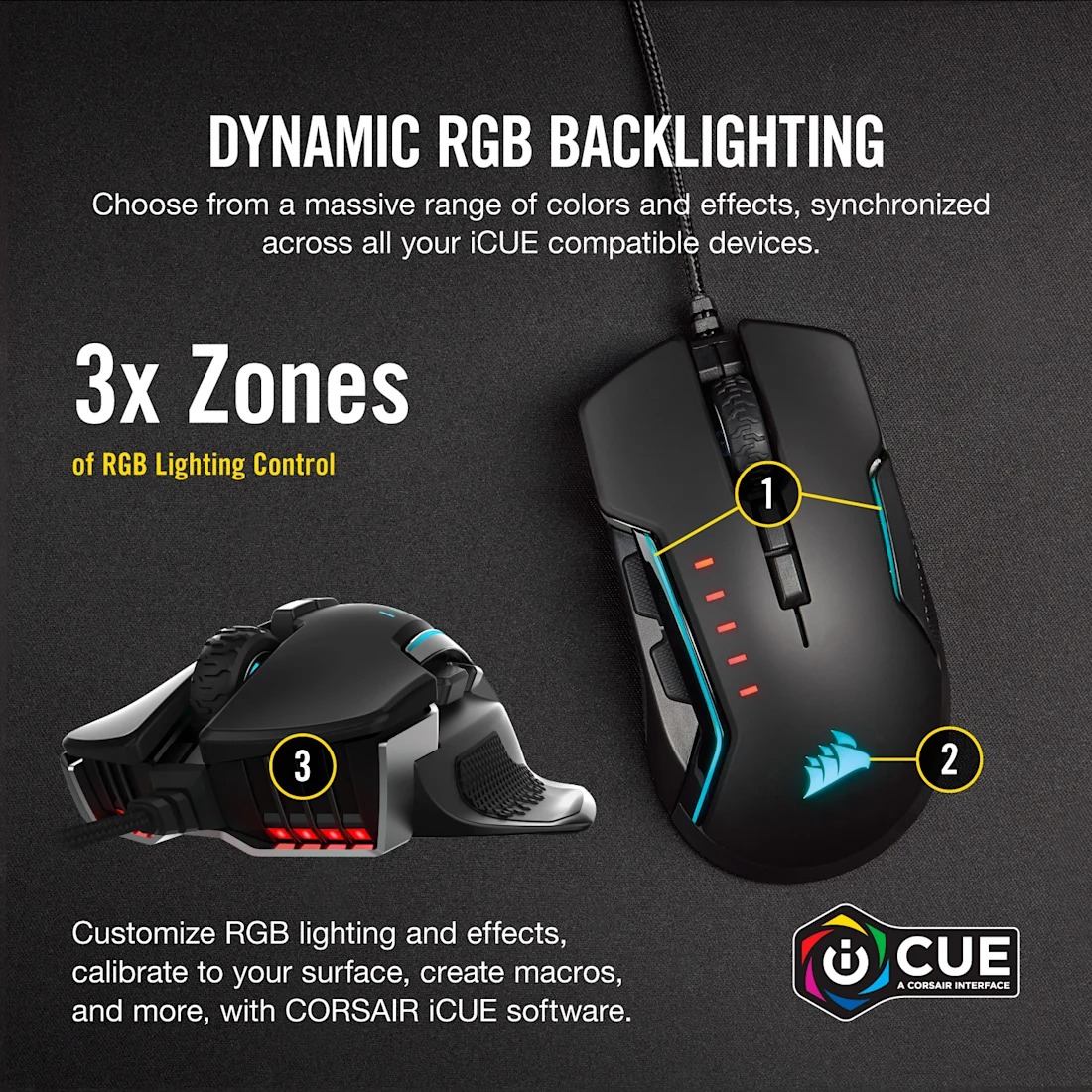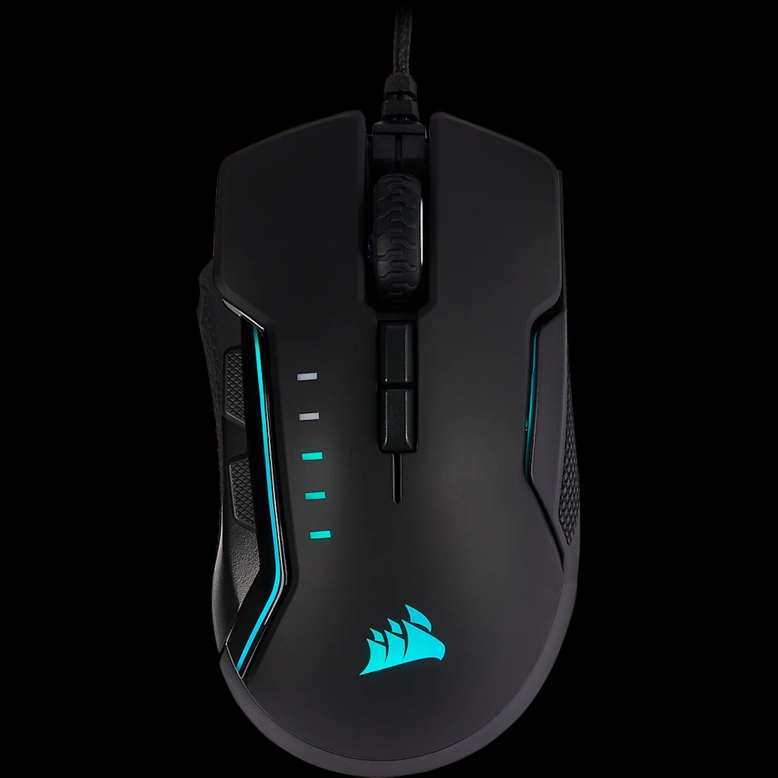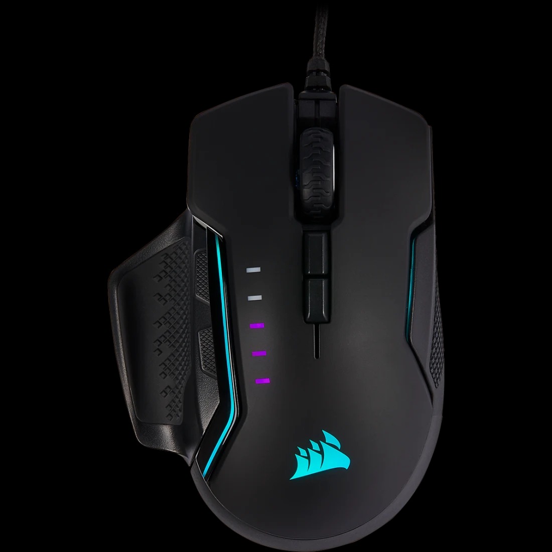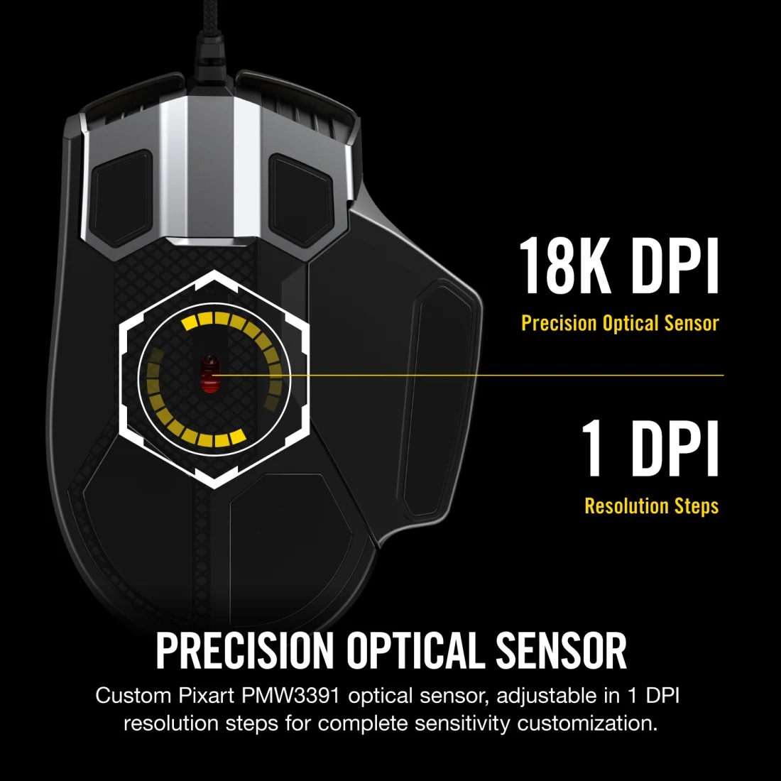 The CORSAIR GLAIVE RGB PRO gaming mouse merges high performance with high comfort, developed with a contoured shape designed for extended gaming sessions and an ultra-accurate, gaming-grade 18,000 DPI optical sensor