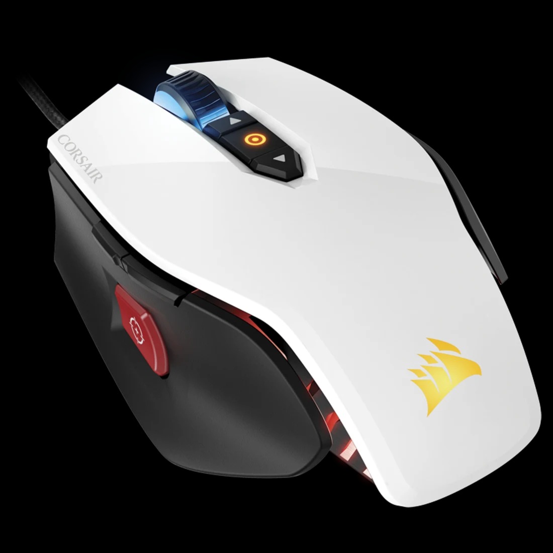 The CORSAIR M65 PRO RGB FPS Gaming Mouse in White is designed for FPS gamers, weighing 168 g with adjustable weight tuning to optimize balance and comfort. It features a PMW3360 optical sensor with selectable report rates of 1000Hz, 500Hz, 250Hz, and 125Hz for precise tracking. The mouse comes with eight fully programmable buttons, durable Omron switches rated for 20 million clicks, on-board memory, and 3-zone RGB backlighting. Its claw-grip design, 1.8m braided fiber cable, and CUE 2.0 software support provide customization and reliable performance for intense gaming sessions. The package includes the M65 PRO RGB FPS Gaming Mouse and a quick start guide