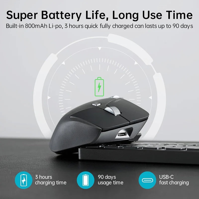 Bluetooth Mouse with Side Scroll & Ergonomic Design: Hall magnetic induction side scroll wheel, ergonomic bow-back design, and anti-slip grip Easy to charge & Ultra-Long Battery Life: 800mAh li-po battery with USB-C quick charge, lasting up to 90 days