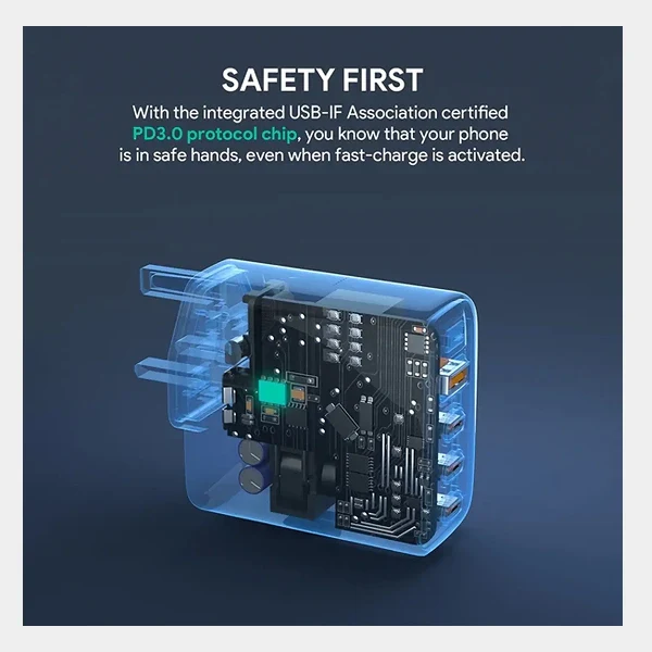 Support PD and Samsung super fast charging, Powerful 100W charges laptops, 3 USB-C and 1 USB-A cater for different charging solutions, Smaller and lighter than regular chargers, Dynamic power allocation, Smart GaN chip