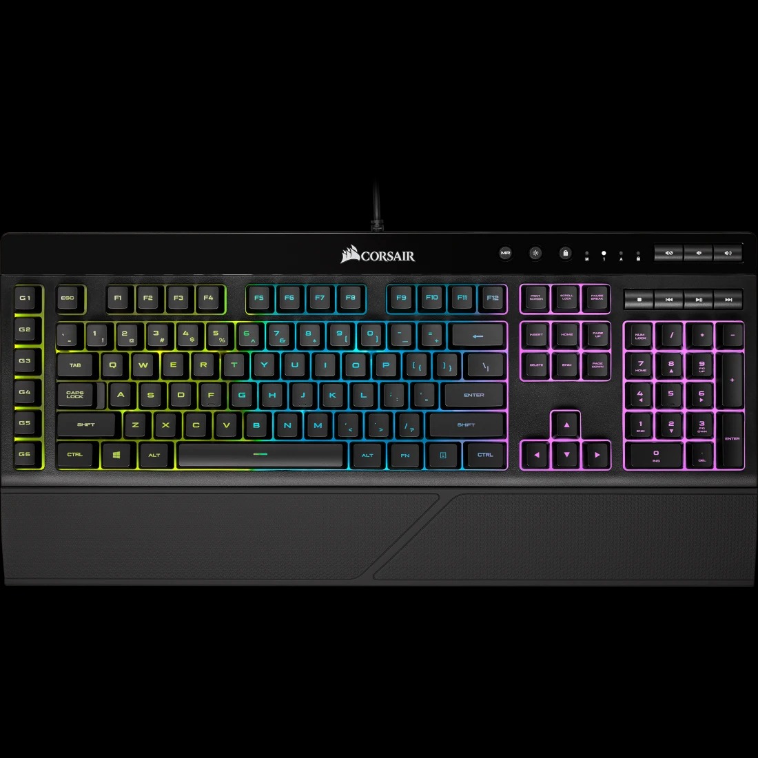 The CORSAIR K55 CORE gaming keyboard features fully customizable ten-zone RGB backlighting and dedicated media control buttons to enhance your gaming experience. It provides quiet, responsive keypresses and vibrant RGB lighting to make your sessions shine. With four dedicated media buttons, as well as Win lock and brightness controls, you can easily manage volume, playback, and additional commands. The keyboard is spill-resistant up to 300ml, allowing you to play without worrying about accidental spills. It also supports 12-key rollover and a 1,000Hz polling rate to ensure every action is registered accurately and without delay.